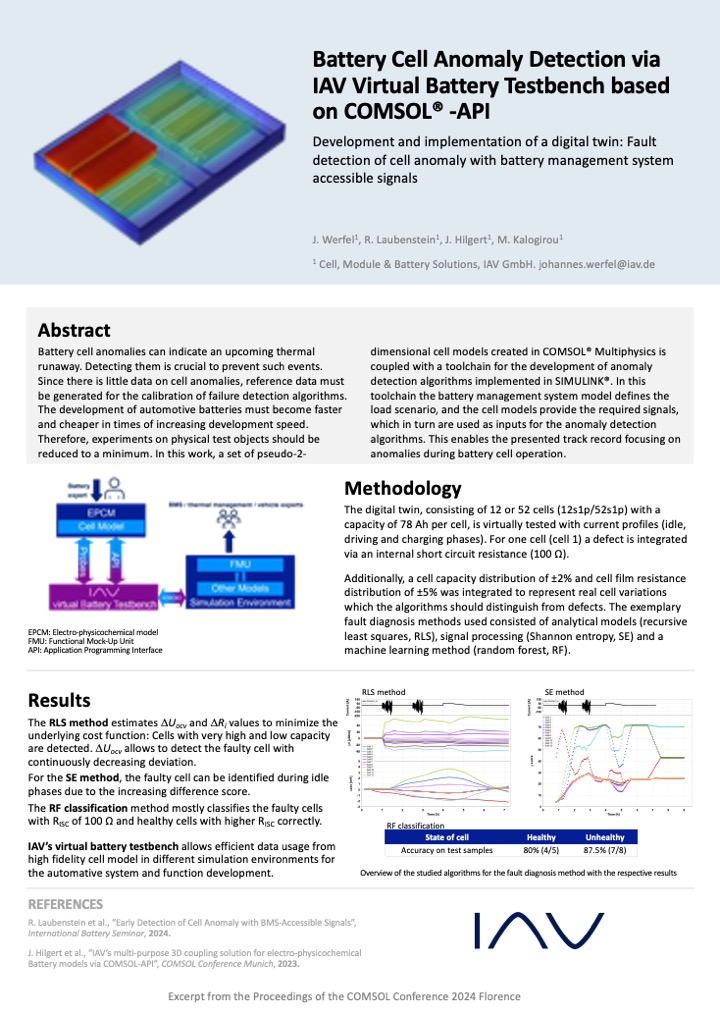 The third Best Poster award went to Johannes Werfel, Reik Laubenstein, Jakob Hilgert, and Maria Kalogirou, a team from IAV GmbH who developed an app for battery cell anomaly detection. The app can be used to identify abnormal behavior in a battery at idle and during runtime, extending the use of COMSOL battery models in automotive system development.