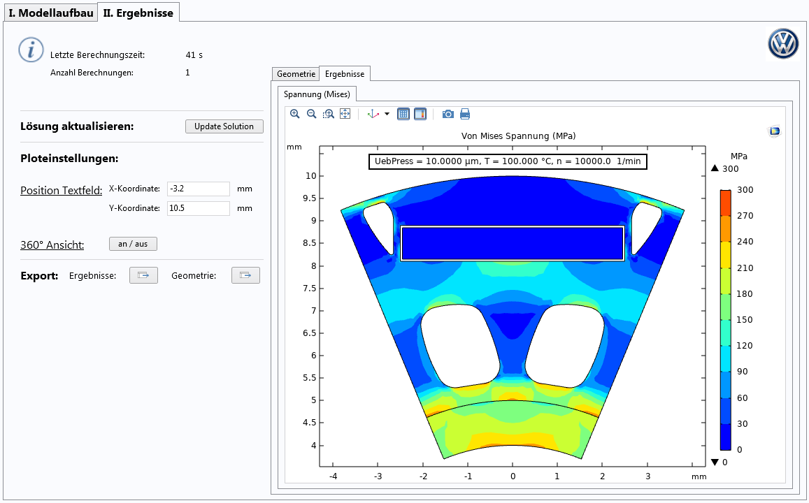 As essential components in electric drives, rotors need to be tested for durability, since they must endure a very large number of revolutions at varying speed and torque during drive operation. However, evaluating the strength of rotor laminations is time consuming. VW Kassel is automating this test process for rotors, as well as reducing development costs and increasing product quality, by building simulation applications with the COMSOL Multiphysics® software.